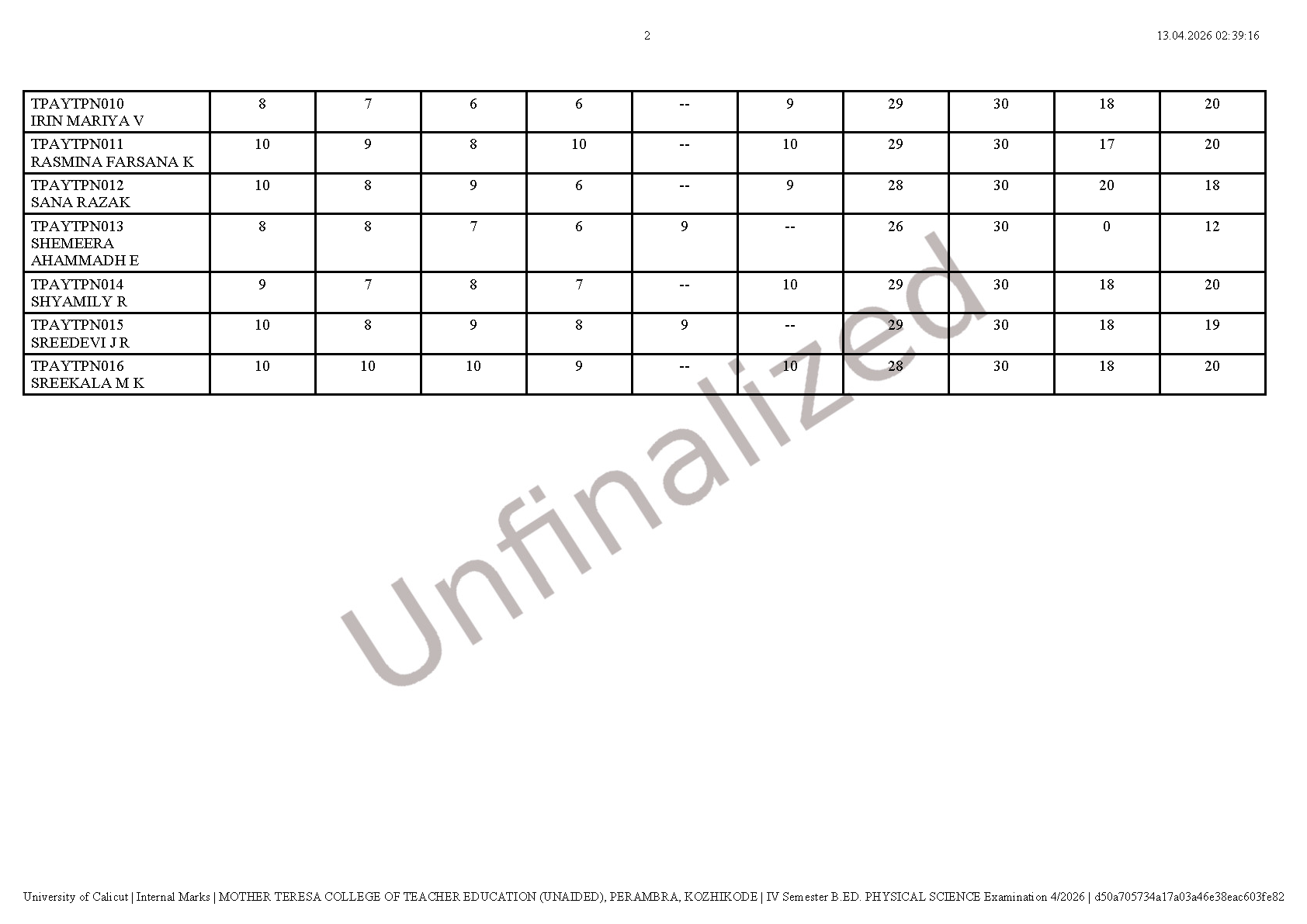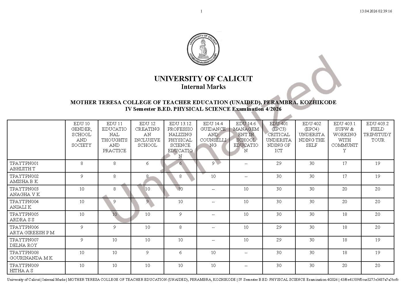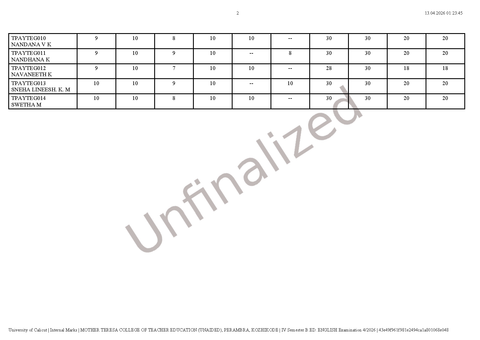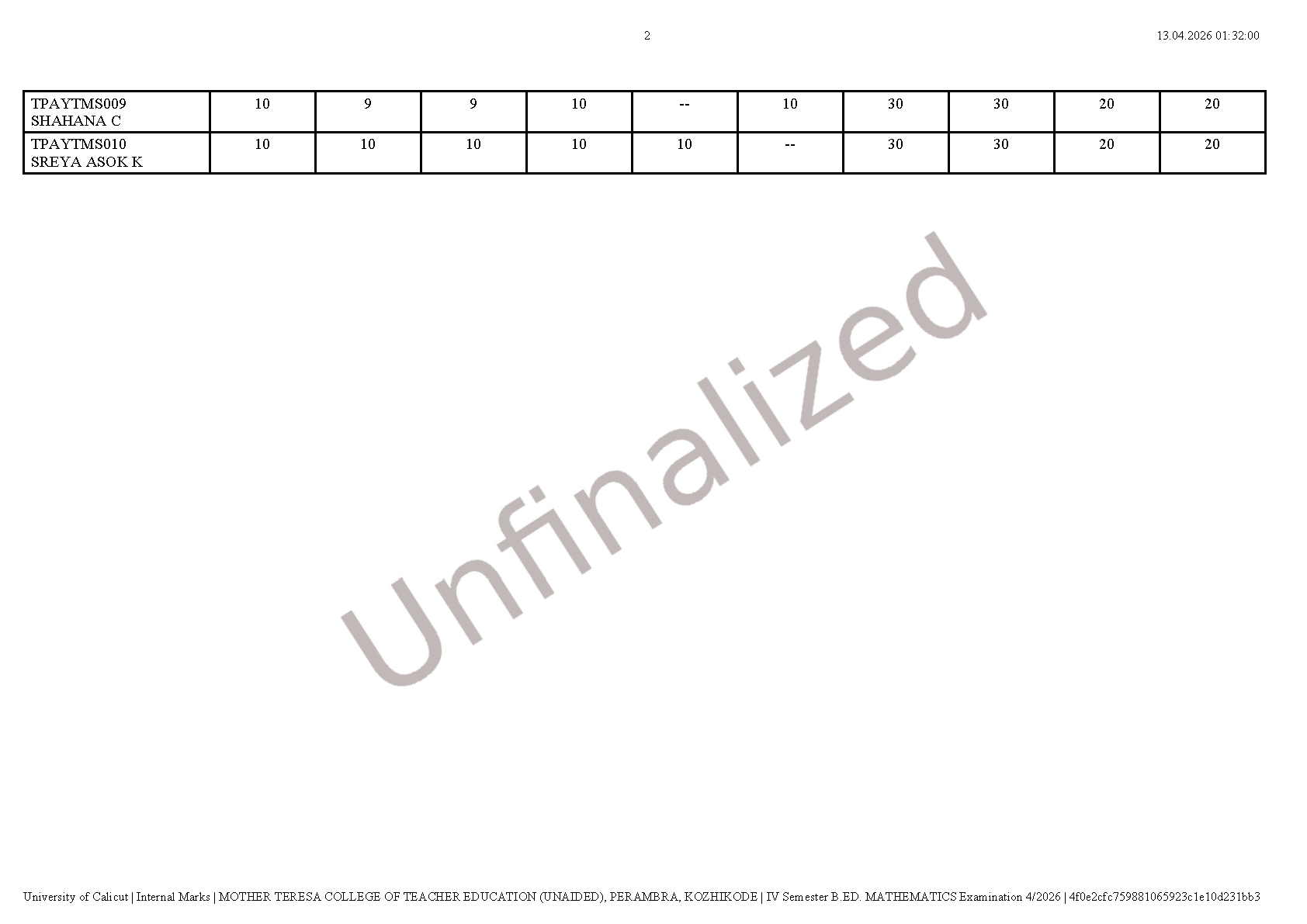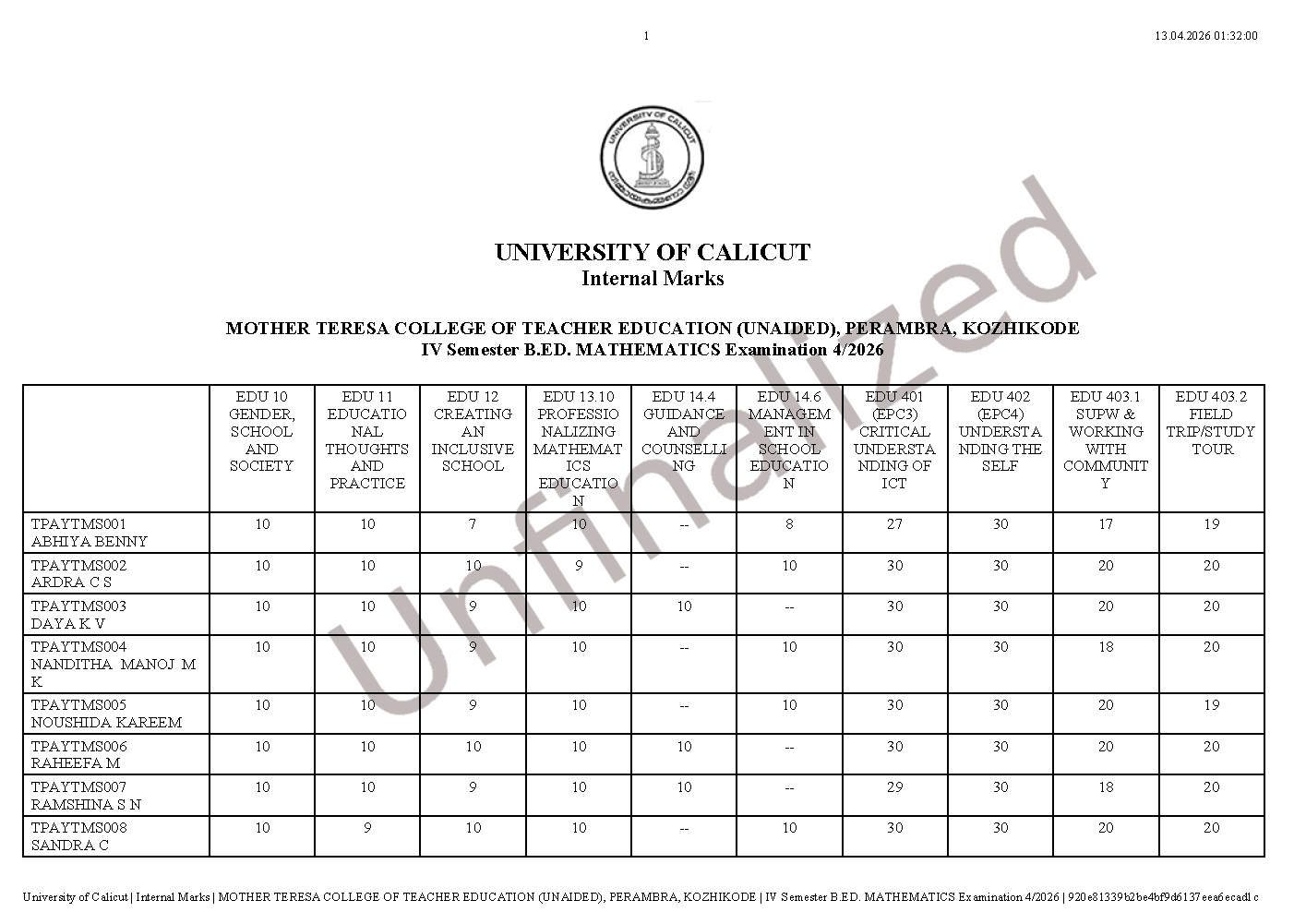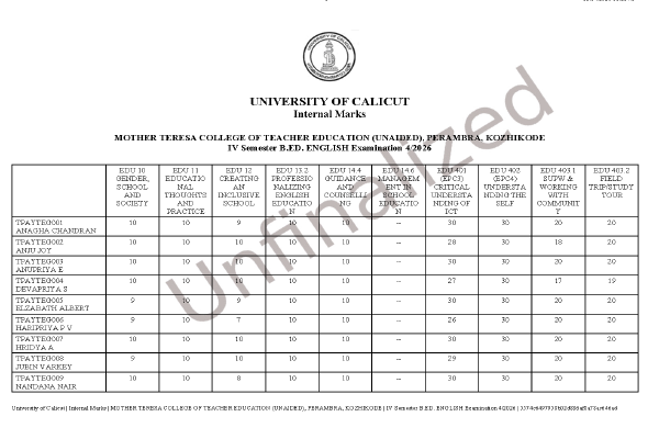 INTERNAL MARKS -IV SEMESTER B.Ed. DEGREE EXAMINATION APRIL 2026 (2024-26 Batch)